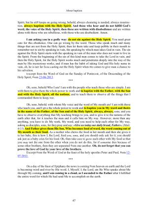 I am asking you in a godly way : do not sin against the Holy Spirit . You need great care for this obedience . One can go wrong by the word . Those who speak much and many things that are not from the Holy Spirit , then let them take and keep pebble in their mouth to remember not to sin by speaking in vain , the speaking by which man takes God in vain . The sin against the Holy Spirit starts with the speaking in vain of the man who does not want to live in the Spirit . From the beginning of the sin of this kind man comes to take the Lord in vain , and then the Holy Spirit , for the Holy Spirit works much and penetrates deeply into the way of the man by His mysterious works , and if man has the habit of taking God and His holy name in vain , oh , he is not far from casting out the Holy Spirit when He comes to give man a chance to his salvation .