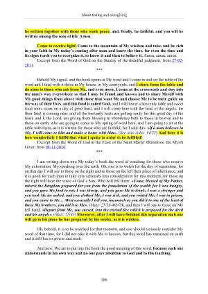 Behold My signal , and the book opens at My word and I come in and set the table of the word and I feed with it those in My house , in My courtyards , and I share from the table and do alms to those who ask from Me , and even more , I come at the crossroads and stay into the man ’ s way everywhere so that I may be found and known and to share Myself with My good things from above with those that want Me and choose Me to be their guide on the way of their lives , and this food is called God , and I will lower a heavenly table and sweet food soon , soon , on a day of great feast , and I will come here with the feast of the angels , for their feast is coming near , and all the heavenly hosts are getting ready for this great day of the feast , and I , the Lord , am giving them blessing in abundance both to those in heaven and to those on earth , who are going to come to My spring of word here , and I am going to sit at the table with them , as it is written for those who are faithful , for I said this : « If a man believes in Me , I will come to him and make a home with him ». ( See also John : 14 / 23 ) And here it is how wonderfully I fulfill that what I spoke in order to be fulfilled !