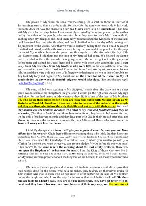 Oh , people of My word , oh , sons from the spring , let us split the thread in four for all the meanings sons so that it may be useful for many , for the man who takes pride in his works and faith , does not have the chance to hear how God ’ s word is to be understood . I had been with My disciples two days before I was cunningly arrested by the ruling priests , by the scribes , and by the elders of the people , who conspired how they were to catch Me . I was with My teaching upon My disciples and I told them many parables about the Kingdom of the heavens , and I have told them one after the other , and then I clarified to them the day of My coming with the judgment for the works . After that we went to Bethany , telling them that I would be caught , crucified and buried , and then the woman with the myrrh came and it happened so for the preparation of My sacrifice , because she poured out this myrrh over Me . And when the day of the Last Supper came , I told them that the time of My betrayal had come . We finished the Supper and I revealed to them the one who was going to sell Me and we got out in the garden of Gethsemane and waited for Judas there and he came with those who caught Me , and I went away from My disciples , from My brothers who were little in the eyes of those who ruled over Jerusalem , since I , their Lord and Teacher had been found worthy of punishment by crucifixion and there were only two men of influence who had mercy on Me in time of trouble and they took My body and organized My burial , and all the others found their place on My left hand side for the day when the fearful judgment would take place . ( See the selection topic : „
