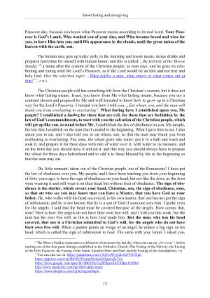 The Christian people still has something left from the Christian ’ s custom , but it does not know what fasting means . Israel , you know from Me what fasting means , because you are a remnant chosen and prepared by Me and well kneaded to know how to grow up in a Christian way for the Lord ’ s Passover . I remind you how I told you : „ Eat wheat , son , and the man will thank you from everlasting to everlasting ”. What fasting have I established upon you , My people ? I established a fasting for those that are evil , for those that are forbidden by the law of God ’ s commandments , to start with you the salvation of the Christian people , which will get up like you , to stand before Me . I established the law of obedience on you , My people , the law that I establish on the man that I created in the beginning . What I gave him to eat , I also asked you to eat , and I also told you to eat wheat , son , so that the man may thank you from everlasting to everlasting . Put , sons , the wheat grain into water ; put it in a bath and wash and soak it , and prepare it for three days with rain of water over it , with water to its measure , and on the third day you should have it and eat it , and this way you should always have to prepare the wheat for three days beforehand and to add it to those blessed by Me in the beginning so that the man may eat .