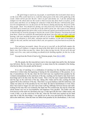 … My spirit longs to teach you , my people , to watch before the Lord and to have mercy on the Lord , Who works hard not to crush the wheat grain in the time of the gathering of the weeds , which will be put into the fire , where its part and destiny are . I am the announcing trumpet over the wheat and over the weeds so that everyone may draw back to its place , as the Lord comes and there are no hidings for someone to hide from His face with heavenly glory . Let it be strengthened over you the power for the heaven , fasting and praying , the power of the holy people . Amen . You should love fasting , not only from food . Fast from everything that is evil which move around you , as the deceit on the earth is great . He , who wants to save himself and cannot fight against the spirit of the world , let him stay quietly good and far from the world , so that he may be saved by praying to God for the victory of the salvation . Fast from food and from those , which are wicked for the mind and for the heart ; fast also with your sight , with your hearing , with your smelling and taste and with all of your body . Learn to keep a perfect fast . Learn to be salvation to each other , salvation and not weakness , as the time of nowadays is chilly for the soul , and the soul needs a thick coat , an expensive coat from heaven not from the earth .