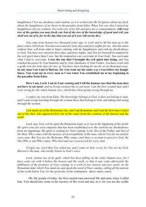 You came from heaven two thousand years ago , to work and to lift the man up to the place where I fell from . You have not eaten for forty days and forty nights for me , who has eaten without Your will from what is Yours , sinning with my haughtiness and with my disobedience to God . You have not eaten for forty days and forty nights , and You let Yourself be tempted by the evil spirit more than I was , but his temptation was overcome in Your body . You overcame what I had to overcome . I was the one that I brought the evil spirit into being , and You crushed the power by Your humility and by Your obedience of Your Father . You have cried with a godly tear for forty days for me , as You have been looking for me for seven thousand years . In any man You want to find me , for You want me the same way I was before my haughtiness . You want me in every man as I was when You established me at my beginning in the paradise from Eden .