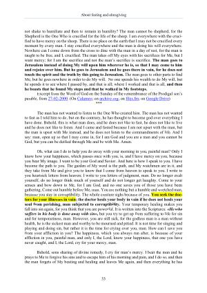 not shake to humiliate and then to remain in humility ? The man cannot be shepherd , for the Shepherd is the One Who is crucified for the life of the sheep . I am everywhere with the crucified to have mercy on the sheep . There is no place on the earth that I may not be crucified every moment by every man . I stay crucified everywhere and the man is doing his will everywhere . Nowhere can I come down from the cross to dine with the man in a day of rest , for the man is taught to be free , and I , crucified . The man takes off My eyes with his sacrifices for Me , but I want mercy ; for I am the sacrifice and not the man ’ s sacrifice is sacrifice . The man goes to Jerusalem instead of doing My will upon him wherever he is , so that I may come to him and rejoice over him . But he goes to Jerusalem and he goes there in vain , for he does not touch the spirit and the truth by this going to Jerusalem . The man goes to other parts to find Me , but he goes nowhere in order to do My will . No one spends his wealth to do My will , but he spends it to see where I passed by , and that is all ; where I worked and that is all , and then he boasts that he found My steps and that he walked in My footsteps .