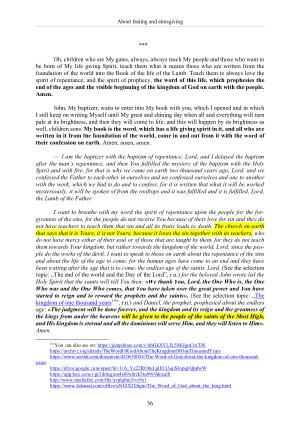 I want to breathe with my word the spirit of repentance upon the people for the forgiveness of the sins , for the people do not receive You because of their love for sin and they do not have teachers to teach them that sin and all its fruits leads to death . The church on earth that says that it is Yours , it is not Yours , because it loves the sin together with its teachers , who do not have mercy either of their soul or of those that are taught by them , for they do not teach them towards Your kingdom , but rather towards the kingdom of the world , Lord , since the people do the works of the devil . I want to speak to those on earth about the repentance of the sins and about the life of the age to come , for the human ages have come to an end and they have been waiting after the age that is to come , the endless age of the saints , Lord , ( See the selection topic : „ The end of the world and the Day of the Lord ”, r . n .) for the beloved John wrote led the Holy Spirit that the saints will tell You then : « We thank You , Lord , the One Who is , the One Who was and the One Who comes , that You have taken over the great power and You have started to reign and to reward the prophets and the saints », ( See the selection topic : „