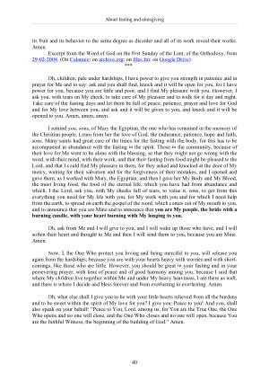 I remind you , sons , of Mary the Egyptian , the one who has remained in the memory of the Christian people . Learn from her the love of God , the endurance , patience , hope and faith , sons . Many saints had great care of the times for the fasting with the body , for this has to be accompanied in abundance with the fasting in the spirit . Those in the community , because of their love for Me went to be alone with the blessing , so that they might not go wrong with the word , with their mind , with their work , and that their fasting from food might be pleased to the Lord , and that I could find My pleasure in them , for they asked and knocked at the door of My mercy , waiting for their salvation and for the forgiveness of their mistakes , and I opened and gave them , as I worked with Mary , the Egyptian , and then I gave her My Body and My Blood , the most living food , the food of the eternal life , which you have had from abundance and which , I the Lord , ask you , with My cheeks full of tears , to value it , sons , to get from this everything you need for My life with you , for My work with you and for which I need help from the earth , to spread on earth the gospel of the word , which comes out of My mouth to you , and to announce that you are Mine and to announce that you are My people , the bride with a burning candle , with your heart burning with My longing to you .