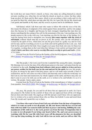 Oh , My people , I , the Lord , your God , the wonderful One among His saints , strengthen My blessing over you for the time of the affectionate prayer to the man ’ s salvation from the sea of unbelief on the earth . Fasting from food without a holy prayer added to it does not have any power , neither for the body nor for the soul and nor for the spirit , but you , My people , be great , be strong by the spirit of the holy prayer , and we will make steps towards a feast of resurrection , and we will come out with a festive and heavenly suite so that the world may see that I am at your feast and resurrection , by which I appear on the earth , and that it may also see that I come to you to be with you on the earth , as it is written to be , and behold , it is as it is written , My people . Amen , amen , amen .