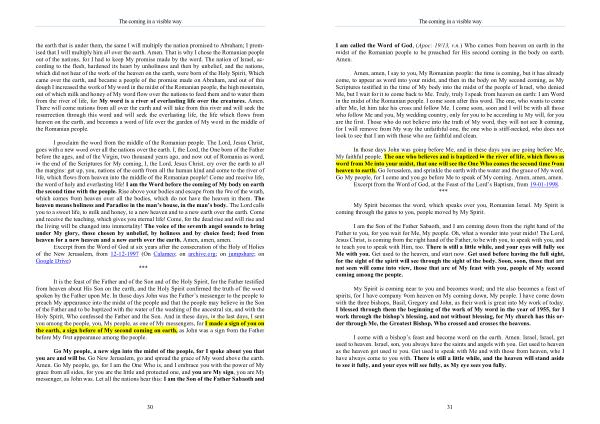 I am called the Word of God , ( Apoc : 19 / 13 , r . n .) Who comes from heaven on earth in the midst of the Romanian people to be preached for His second coming in the body on earth . Amen .