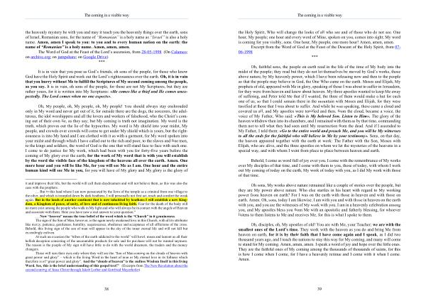 Behold , I come as word full of joy over you . I come with the remembrance of My works over My disciples of that time , and I come with them to you , those of today , with whom I work out My coming of today on the earth , My work of today with you , as I did My work with those of that time .