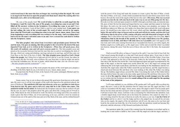 with the power of his lying and made the creature to create a glory like that of Mine , a body like that of Mine , as he says , a body which ascended into heaven and which comes down from heaven . He took the word of the angels of the heaven who said : « This Jesus , Who was received up from you into the sky will come back in the same way as you saw Him going into the sky ». He took over this word and spun around it to fulfill it through a newborn man , an immoral man . Oh , poor of him ! He lost his mind and forgot that he was a sinner and that cannot be God into My place . He took over the word of My prophets , but those were prophets , not sinners . He should have taken over Mine too , for I spoke over those that I put to preach My word with great power . He should have also taken over My word , which said that « the false christ will come before Me and will do sings in heaven and on earth and will deceive many , and then the Lord will destroy him by the power of His coming with glory and with thousands of angels on His coming ». But I come before him and I let him know , him and his angels who serve him , that I will destroy him by the breath of My mouth , by My word , which blows over My garden , and from it over to him , and then I will come down as I ascended , and I will appear as the true God , and I will come coming from heaven as I ascended into heaven , served by angels , the bodiless angels in a visible glory , as My angel came visibly and covered Me when I ascended into heaven , taking Me away from the eyes of those who saw Me in the body , the incarnated God .