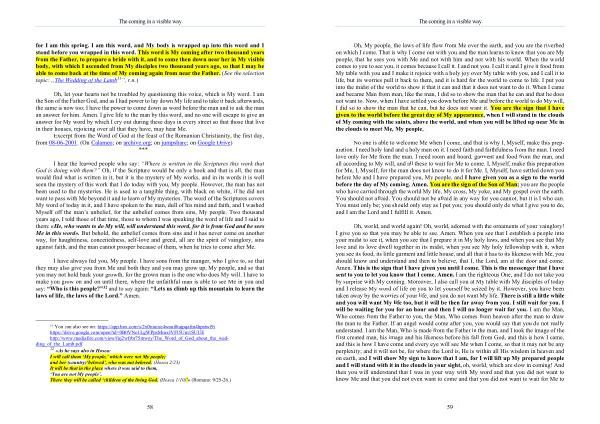 Oh , world , and world again ! Oh , world , adorned with the ornaments of your vainglory ! I give you so that you may be able to see . Amen . When you see that I establish a people into your midst to see it , when you see that I prepare it in My holy laws , and when you see that My love and its love dwell together in its midst , when you see My holy fellowship with it , when you see its food , its little garment and little house , and all that it has to its likeness with Me , you should know and understand and then to believe , that I , the Lord , am at the door and come . Amen . This is the sign that I have given you until I come . This is the messenger that I have sent to you to let you know that I come . Amen . I am the righteous One , and I do not take you by surprise with My coming . Moreover , I also call you at My table with My disciples of today and I release My word of life on you to let yourself be seized by it . However , you have been taken away by the worries of your life , and you do not want My life . There is still a little while and you will want My life too , but it will be then far away from you . I still wait for you . I will be waiting for you for an hour and then I will no longer wait for you . I am the Man , Who comes from the Father to you , the Man , Who comes from heaven after the man to draw the man to the Father . If an angel would come after you , you would say that you do not really understand . I am the Man , Who is made from the Father in the man , and I took the image of the first created man , his image and his likeness before his fall from God , and this is how I came , and this is how I have come and every eye will see Me when I come , so that it may not be any perplexity ; and it will not be , for where the Lord is , He is within all His wisdom in heaven and on earth , and I will show My sign to know that I am , for I will lift up My prepared people and I will stand with it in the clouds in your sight , oh , world , which are slow in coming ! And then you will understand that I was in your way with My word and that you did not want to know Me and that you did not even want to come and that you did not want to wait for Me to
