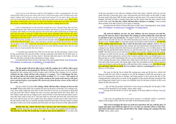 This word is bringing Me down on earth now and before My day with the glory of angels and saints and within the sight of every eye that was and that will be at that time , and which will stand to meet Me , and all will see My visible coming , the coming of the Son of Man . Amen , amen , amen .