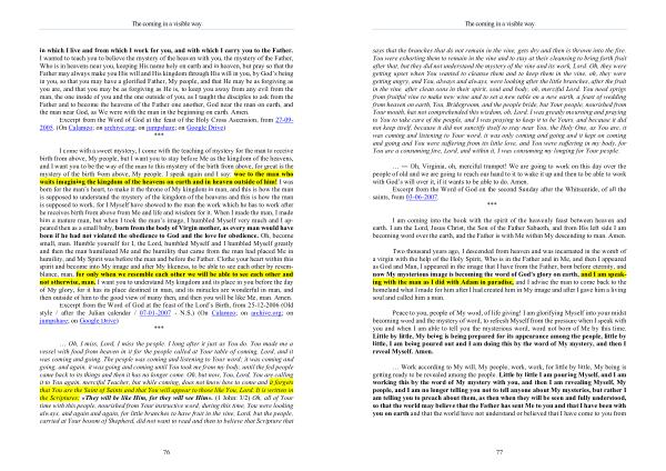 … Oh , I miss , Lord , I miss the people . I long after it just as You do . You made me a vessel with food from heaven in it for the people called at Your table of coming , Lord , and it was coming and going . The people was coming and listening to Your word ; it was coming and going , and again , it was going and coming until You took me from my body , until the fed people came back to its things and then it has no longer come . Oh , but now , You , Lord , You are calling it to You again , merciful Teacher , but while coming , does not know how to come and it forgets that You are the Saint of Saints and that You will appear to those like You , Lord . It is written in the Scriptures : « They will be like Him , for they will see Him ». ( 1 John : 3 / 2 ) Oh , all of Your time with this people , nourished from Your instructive word , during this time , You were looking always , and again and again , for little branches to have fruit in the vine , Lord , but the people , carried at Your bosom of Shepherd , did not want to read and then to believe that Scripture that