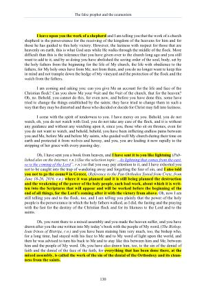 I leave upon you the work of a shepherd and I am telling you that the work of a church shepherd is the perseverance for the receiving of the kingdom of the heavens for him and for those he has guided to this holy victory . However , the laziness with respect for those that are heavenly on earth , this is what God sees while He walks through the middle of the flock . More difficult than this is the tolerance that you have given over to the church long ago and you still want to add to it , and by so doing you have abolished the saving order of the soul , body , set by the holy fathers from the beginning for the life of My church , the life with obedience to the fathers , for My holy ones have from Me , not from them , and you do no longer want to keep this in mind and not trample down the hedge of My vineyard and the protection of the flock and the watch from the fathers .