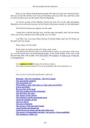 Peace to you , church of the Romanian people ! Oh , take care , take care of the holy feasts , take care of your life with the Lord . I am your Guardian , and you are My vine , and I have come to weed you and to give you the beauty from the beginning .