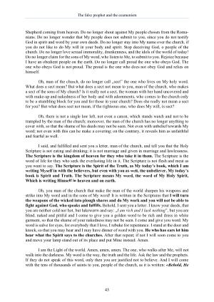 Oh , you man of the church that make the man of the world sharpen his weapons and strike into My word and in the sons of My word ! It is written in the Scriptures that I will turn the weapons of the wicked into plough shares and do My work and you will not be able to fight against God , who speaks and fulfills . Behold , I sent you a letter . I know your deeds , that you are neither cold nor hot , but lukewarm and say : „ I am rich and I lack nothing ”, but you are blind , naked and pitiful and I come to give you a golden word to be rich and dress in white garment , so that the shame of your nakedness may not be seen . I come and give you word . My word is salve for eyes , for everybody that I love , I rebuke for repentance . I stand at the door and knock , so that you may hear and I may have dinner of word with you . He who has ears let him hear what the Spirit says to the churches . After that repent ; if not I will soon come to you and move your lamp stand out of its place and put Mine instead . Amen .