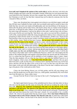 Sons , sons , the priests have risen against you to deceive you with their empty words and they fill their cup of unbelief by their words , but you should watch and be careful to those who think that they can steal your minds with philosophy and vain deceitfulness of the human tradition after the ghosts and not after Christ . Take heed to those who are written in the Scriptures about Me , as though the entire fullness of the godhead dwells in Me , and I have the head over the entire reign and dominion ; I and not the ghosts on the earth ; I and not those who set themselves up as God by not receiving Me . Take heed , sons , and as you received Me so should you walk in Me , rooted and built within Me , being strengthened in faith as I have exhorted you , and prospering in faith with the whole of your hearts ’ discontentment , children sons . Watch all the time praying so that you may become worthy of all these which will come and stand before Me at My coming . Amen . Watch all the time in prayer , for too many false prophets have risen and sat into My name in the church and deceive many with the philosophy of their empty words because of which God ’ s wrath comes over the sons of disobedience , over the sons of unbelief , well , well , My faithful little children . False prophets do not have names of Christs but only in the church , sons , for they have borrowed My name and put over the empty philosophy of their words , and it is written : « Let no one deceive you in any way , as for these God ’ s wrath comes over the sons of disobedience ». And when God ’ s kingdom comes , I will be the true Christ of My Father and it will be fulfilled the Passover , which I ate with longing into the midst of My faithful disciples and together with them before My passion and My resurrection , for it is written that that Passover will be fulfilled in God ’ s kingdom when it comes . Amen . Then the false prophets will see what the true Christ is and what the fulfilled Passover is in God ’ s kingdom , which comes , but I say that it has already come , and those who are great hide from God ’ s wrath , for they have not watched to know and that their house may not be torn down , and they fell into the edge of the sword of My word , for they have cast Me away with their empty words and with their philosophy of the deceit from the man ’ s tradition and according to the ghosts of the world and not after Christ .