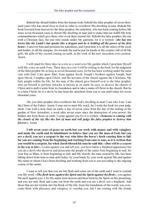 Behold the thread hidden from the human look ; behold the false prophet of seven thousand years who has stood close to God in order to overthrow His dwelling in man . Behold My book lowered from heaven for the false prophet , the antichrist , who has been coming before Me since seven thousand years to thwart My dwelling in man and to make him not fulfill My holy commandments which give those who work them eternal life . Behold the false prophet , the one with a Christian face , the one who stands under My garment , for it is written : « He has two horns like the Lamb ’ s but speaks like a dragon and he is holding all the power of the first beast ». I uncover him and proclaim his nakedness , and I proclaim it to all the rulers of the souls and bodies , to all the margins , for towards the end he put his heads in My country full of all My gifts , the gifts of My second coming on earth , in the work of the new Jerusalem over creation . Amen .