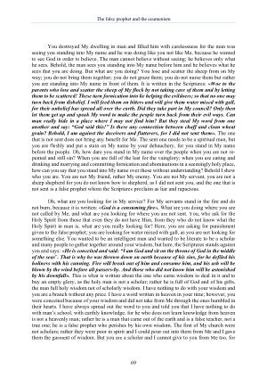You destroyed My dwelling in man and filled him with carelessness for the man was seeing you standing into My name and he was doing like you not like Me , because he wanted to see God in order to believe . The man cannot believe without seeing ; he believes only what he sees . Behold , the man sees you standing into My name before him and he believes what he sees that you are doing . But what are you doing ? You lose and scatter the sheep from on My way ; you do not bring them together ; you do not graze them ; you do not nurse them but rather you are standing into My name in front of them . It is written in the Scriptures : « Woe to the parents who lose and scatter the sheep of My flock by not taking care of them and by letting them to be scattered ! These turn fornication into lie helping the evildoers ; so that no one may turn back from disbelief . I will feed them on bitters and will give them water mixed with gall , for their unbelief has spread all over the earth . Did they take part in My council ? Only then let them get up and speak My word to make the people turn back from their evil ways . Can man really hide in a place where I may not find him ? But they steal My word from one another and say : “ God said this !” Is there any connection between chaff and clean wheat grain ? Behold , I am against the deceivers and flatterers , for I did not sent them ». The one that is not sent does not bring any benefit for Me . The sent one needs to be a spiritual man , but you are fleshly and put a stain on My name by your debauchery , for you stand in My name before the people . Oh , how dare you stand in My name over the people when you are not repented and still sin ? When you are full of the lust for the vainglory ; when you are eating and drinking and marrying and committing fornication and abominations in a seemingly holy place , how can you say that you stand into My name over those without understanding ? Behold I show who you are . You are not My friend , rather My enemy . You are not My servant , you are not a sheep shepherd for you do not know how to shepherd , as I did not sent you , and the one that is not sent is a false prophet whom the Scriptures proclaim as liar and rapacious .