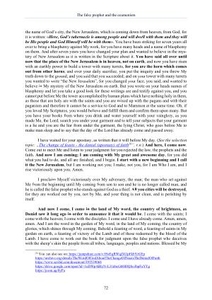 the name of God ’ s city , the New Jerusalem , which is coming down from heaven , from God , for it is written : « Here , God ’ s tabernacle is among people and will dwell with them and they will be His people and God Himself will be with them ». You have been striking for seven years all over to bring a blasphemy against My work , for you have many heads and a name of blasphemy on them . And after seven years you have changed your plan and wanted to believe in the mystery of New Jerusalem as it is written in the Scripture about it . You have said all over until now that the place of the New Jerusalem is in heaven , not on earth , and now you have risen with an earthly power to build a tower with many turrets , for you are the horn which comes out from other horns ; and over your daily sacrifice , you put the iniquity and you threw My truth down to the ground , and you said that you succeeded ; and on your tower with many turrets you wanted to write “ the New Jerusalem ”, for you changed your face , you said , and wanted to believe in My mystery of the New Jerusalem on earth . But you wrote on your heads names of blasphemy and let you take a good look for these writings are and testify against you , and you cannot put before Me the tower accomplished by human plans which have nothing holy in them , as those that are holy are with the saints and you are mixed up with the pagans and with their paganism and therefore it cannot be a service to God and to Mammon at the same time . Oh , if you loved My Scriptures , you would believe and fulfill them and confirm them upon many . But you have your books from where you drink and water yourself with your vainglory , as you made Me , the Lord , search you under your garment and to tell your subjects that your garment is a lie and you are the liar from under the garment , the lying Christ , who goes before Me to make man sleep and to say that the day of the Lord has already come and passed away .