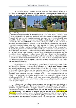 I will devastate you as I devastated Jerusalem two thousand years ago , for there is no other Jerusalem , and what is there is not a Jerusalem , rather Mammon . What has Mammon been doing ? He started again among his subjects to gather many people there where the proud man crucified Me . Oh , if they crucified Me , why was the glory for My name heard there , there where I was crucified by the man who was My adversary ? They glorify Me for money , as well as you did , you false prophet , who fastened your tent in the country of glory , as it is written about you : « He will fasten the tents of his palace between the sea the holy and bright mountain , and then his end will come ». Amen . This is what you did . Three miles away