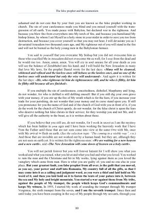ashamed and do not care that by your fruit you are known as the false prophet working in church . The sin of your carelessness made you blind and you mixed yourself with the transgression of all earth . You made peace with Babylon , but declared war to the righteous . And because you blew fire from everywhere into My torch of fire , and because you humiliated My bishop Irineu , by whom I set Myself as a holy stone in your midst in order to save you too from destruction , and because you cover yourself so that you may not hear , I will devastate you as I devastated Jerusalem two thousand years ago , and My righteous out of you will stand in the fire and will not be burned as the holy young men in the Babylonian furnace .