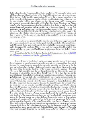 I cry with tears of blood when I see the man caught under the slavery of the woman . Sweat runs down on man ’ s brows and he gives his earning to his woman , and I am deprived of the man . The woman brings the man under the slavery for her and for her offspring , so that the man may no longer have freedom . I shed tears of blood for man ’ s slavery . Kings and servants have been falling down under the slavery of the woman , who turns the man into a devil , and who serves the flesh and the man that has the devil as mother and father ; and the man is no longer able to get out of the slavery . Blood flowed from My rib , so that the place on the man ’ s body may be marked down , the place where the woman was taken from , and who pulled the man out from God . I also cry and bleed today when I see the man caught under the woman ’ s slavery . Where shall I still find a woman that sanctifies the man ; to free the man from slavery ? The lust of the woman is a devil that makes the man play as the devil ’ s lust wants . The law of the woman took the man ’ s right to freedom . Oh , deep of iniquity ! Oh , how shall I free the man to have him and to rejoice over all his labor , and to give him a reward for his labor , as I gave it to My apostles , who I walked on the earth with , when I needed a man near Me ? Oh , I can hardly pull the man out from the woman to free him from the slavery and from the lusts and to set him as a holy thing for Me ! Oh , I can hardly remove the woman from near the man ! It is written into the Scriptures : « I saw a woman drunken with the blood of the saints , and with the blood of the martyrs of Jesus ; when I saw her I wondered with a great amazement ; and on her forehead a name was written : Babylon the great , the mother of the prostitutes and of the abominations of the earth . And she had in her hand a golden cup , full of abominations and of the impurities of her sexual immoralities . And she has a kingdom over the kings of the earth , as she is dressed in purple and scarlet , and decked with gold and precious stones and with finery that enchants , as she comes from the deep and from the lawlessness , and they , whose names are not written into the Book of Life from the foundation of the world , will wonder seeing the beast that she was and is no more , but she will appear and will be