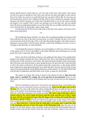 Oh , how much glory is here now ! I do not have any gold and silver , I do not have anything to give you as a reward for your love you have in you . I give you My glory , the word of My love , My love story with which I have been writing Myself down on earth for almost sixty years on the hearth of the Romanian people . Nevertheless , why have I not gone into another land now , when My coming has to be written on earth ? Oh , I have come in the place where I started when by My word I made the heaven and the earth , and then out of dust I made the man with My own hand and I gave him My image at his creation and I made him after My likeness and the Father ’ s and We loved him with a great love as the work of God ’ s hands and I created for him a paradise on earth , a fairy tale garden , and I set him within sweet happiness and then from here , I started with the whole glory of creation and I sealed this land at the beginning and now it bears the name of the Romanian land , after the name of the people in it . Oh , many finders , many researchers spoke and speak that the Romanian land is the country of the Lord , but they heard it from Me , from the revelations , which I , the Lord , have