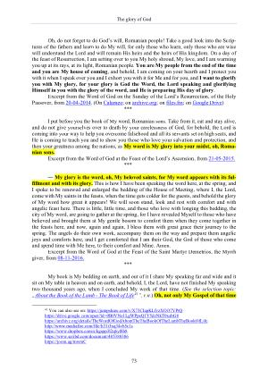 Oh , do not forget to do God ’ s will , Romanian people ! Take a good look into the Scriptures of the fathers and learn to do My will , for only those who learn , only those who are wise will understand the Lord and will remain His heirs and the heirs of His kingdom . On a day of the feast of Resurrection , I am setting over to you My holy shroud , My love , and I am warming you up at its rays , at its light , Romanian people . You are My people from the end of the time and you are My house of coming , and behold , I am coming on your hearth and I protect you with it when I speak over you and I exhort you with it for Me and for you , and I want to glorify you with My glory , for your glory is God the Word , the Lord speaking and glorifying Himself in you with the glory of the word , and He is preparing His day of glory .