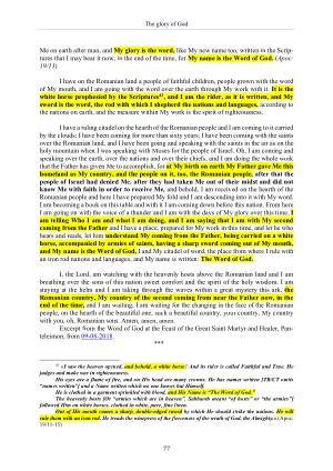 I have a ruling citadel on the hearth of the Romanian people and I am coming to it carried by the clouds ; I have been coming for more than sixty years ; I have been coming with the saints over the Romanian land , and I have been going and speaking with the saints in the air as on the holy mountain when I was speaking with Moses for the people of Israel . Oh , I am coming and speaking over the earth , over the nations and over their chiefs , and I am doing the whole work that the Father has given Me to accomplish , for at My birth on earth My Father gave Me this homeland as My country , and the people on it , too , the Romanian people , after that the people of Israel had denied Me , after they had taken Me out of their midst and did not know Me with faith in order to receive Me , and behold , I am received on the hearth of the Romanian people and here I have prepared My fold and I am descending into it with My word . I am becoming a book on this table and with it I am coming down before this nation . From here I am going on with the voice of a thunder and I am with the days of My glory over this time , I am telling Who I am and what I am doing , and I am saying that I am with My second coming from the Father and I have a place , prepared for My work in this time , and let he who hears and reads , let him understand My coming from the Father , being carried on a white horse , accompanied by armies of saints , having a sharp sword coming out of My mouth , and My name is the Word of God , I and My citadel of word , the place from where I rule with an iron rod nations and languages , and My name is written : The Word of God .