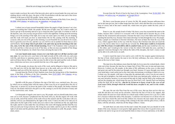 Let your hands make many crosses over your body and over all that you have and use , sons . Let your feet carry your body in the light towards all My wills with you , and yours with Me , and always to announce peace to you , and you should also leave your hearts in Me and in all those that are Mine , so that you may be able to have the spirit and the work of obedience , which does not leave you to perish from the way of the angels of light .