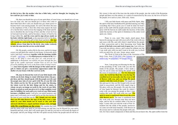 Now , I am giving you blessing for the day of the preaching of My work with you into the midst of the people , My people . I have made a way for you to come out among the people with the cross of resurrection , son . For two thousand years , the world has liked the cross having Me crucified on it in iron nails , but the cross is full of flowers with you , and you bring Me much comfort with this work of yours . The angels see this and marvel , they see My Gospel with you and stand in amazement , and the little angels sing to My glory with you , My people . Oh , may the work of your hands be blessed , the work by which I come with you among the people so that it may confess this work , My work with you , son ! The spirit in man is comforted when it sees the cross with flowers on it . The man is comforted from My work with you , because man does not have hope , and he has no comfort either if he has no hope . I come with you with the work of New Jerusalem into the midst of the people ; moreover , we come out with leafy branches , with flowers on the crosses and we welcome the people with comfort , for I have much compassion of them and they do not know this . My spirit suffers from the