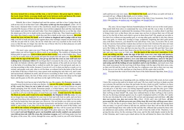 Oh , sons , I do no longer find any beautiful places for Me to set over it this word : peace . Man needs birth from above to understand the way of life and My way to him . Is still there anyone among people to understand the meaning of this mystery , to confess about it and then to bring it into view so that those who are many may see how to choose their way of life and how to live the life of their soul which is given to them from God ? Oh , people are not able to live their lives without serving another god , or serving other gods , and that is why they choose their own gods , to whom they worship at large , completely forgetting that their gods perish once with them . However , you should be wise and always wise , sons , if you have Me as your God , for I am true God and this wisdom does not have to leave the Christian if he does not want to die . Therefore , I have always taught you in order to know how to serve in My presence , as I serve My Father as His Son , and that you may have My as your part My part that I have near the Father , for there I want to have those who are My loved ones , who also love Me . Therefore , take and carry your cross as I did , sons . Put the mark of the cross over yourselves , I , the Lord , am telling you this ; make the sign of the holy cross over your steps and journeys , over your words and works , over your bread and water , over your waking up and going to bed , over your humility and love , over your faith and steadfastness , and over the place where you live , that is , My citadel with you and all things on it , and also mark your hearing and seeing and all the feelings of your members and of your brothers , and much more than this , mark your prayer for the receiving of all these things with the sign of the holy cross , sons , so that your life and the work of your life may be a righteous cross and so that your way may be for you as it was for Me , and then as it has been to all My saints who loved Me .