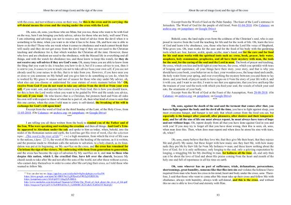 This word is the river of life 23 ”, r . n .) a high mountain , from which the river of life runs to the nations , ( Apoc : 22 / 1 ), the word of His mouth to the healing of the nations , as it is written , and the promise made to Abraham calls the nations to salvation , to a holy church , as its foundation was put at its beginning , on My sacrifice on the cross , and the cross has remained for Christians the sign of the victory , My embracing with them from generation to generation , and the cross has become the sign of salvation by My sacrifice on it , and woe to those who despise this nation , which I , the crucified One , have left over the church , because My church needs to take after Me and not after the sons of the world , not after those without a cross , who cannot deny themselves in order to come after Me carrying their cross , as I told those who wanted to follow Me .