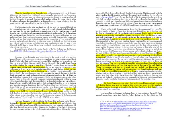 Make the sign of the cross , Romanian son , and keep away the evils and all dangers . ( Allusion to the Corona virus , r . n .) Let all your priests gather together with you for prayer to God so that the Lord may send you holy protection , angels and saints to protect you from all that is evil on earth , for on earth there are whole nations without the cross , without saints from heaven , because they do not believe in them , and you have a great inheritance from the saints who have left your path to God and that of God to you .