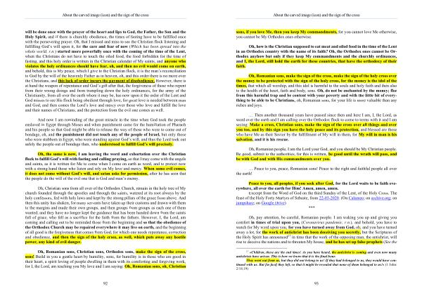 Oh , Romanian sons , make the sign of the cross , make the sign of the holy cross over the money to be protected with the sign of the holy cross , for the money is the idol of the times , that which all worship , and this idol is harmful to the souls and holy faith and then also to the health of the heart , faith and body , sons . Oh , do not be enchanted by the money ; flee from this harmful trap and be content with your poverty and with the little bit of everything to be able to be Christians , oh , Romanian sons , for your life is more valuable than any riches and joys .