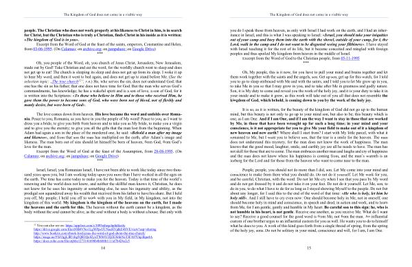 Israel , Israel , you Romanian Israel , I have not been able to work like today since two thousand years upon you , but I am working today upon you more than I have worked in all the ages on the earth . The time has come today to make you for the heaven . Today is that time of the world ’ s renewing and the world does not know , and neither the skillful man knows it , Christian , he does not know for he uses his ingenuity at something else , he uses his ingenuity and ability , as the prodigal son squandered away his wealth that received from his father to have his share . But I held you off , My people ; I held you off to work with you in My field , in My kingdom , not into the kingdom of this world . My kingdom is the kingdom of the heavens on the earth , for I made the heavens and the earth for this . The heaven without the earth cannot be a kingdom , as the body without the soul cannot be alive , as the soul without a body is without a house . But only with