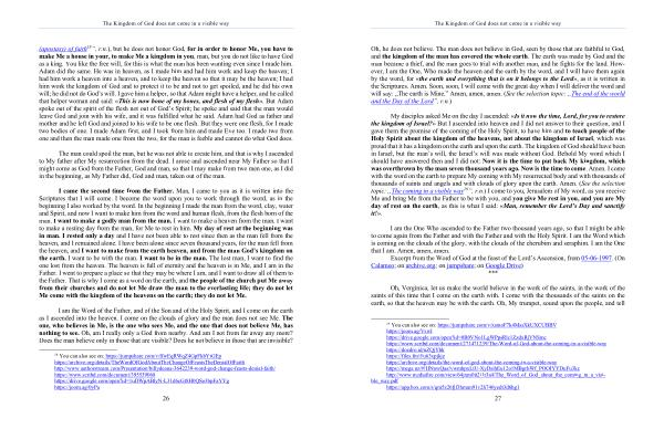 I came the second time from the Father . Man , I came to you as it is written into the Scriptures that I will come . I become the word upon you to work through the word , as in the beginning I also worked by the word . In the beginning I made the man from the word , clay , water and Spirit , and now I want to make him from the word and human flesh , from the flesh born of the man . I want to make a godly man from the man . I want to make a heaven from the man . I want to make a resting day from the man , for Me to rest in him . My day of rest at the beginning was in man . I rested only a day and I have not been able to rest since then as the man fell from the heaven , and I remained alone . I have been alone since seven thousand years , for the man fell from the heaven , and I want to make from the earth heaven , and from the man God ’ s kingdom on the earth . I want to be with the man . I want to be in the man . The lost man , I want to find the one lost from the heaven . The heaven is full of eternity and the heaven is in Me , and I am in the Father . I went to prepare a place so that they may be where I am , and I want to draw all of them to the Father . That is why I come as a word on the earth , and the people of the church put Me away from their churches and do not let Me draw the man to the everlasting life ; they do not let Me come with the kingdom of the heavens on the earth ; they do not let Me .