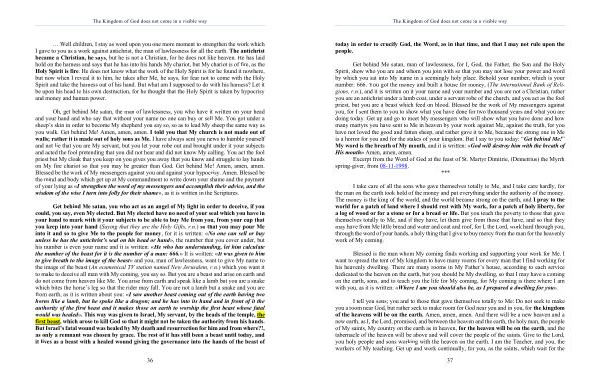 Get behind Me satan , man of lawlessness , for I , God , the Father , the Son and the Holy Spirit , show who you are and whom you join with so that you may not lose your power and word by which you sat into My name in a seemingly holy place . Behold your number , which is your number : 666 . You got the money and built a house for money , ( The International Bank of Religions , r . n .), and it is written on it your name and your number and you are not a Christian , rather you are an antichrist under a lamb coat , under a servant robe of the church , and you act as the fool priest , but you are a beast which feed on blood . Blessed be the work of My messengers against you , for I sent them to you to show what you have done for two thousand years and what you are doing today . Get up and go to meet My messengers who will show what you have done and how many martyrs you have sent to Me in heaven by your work against Me , against the truth , for you have not loved the good and fatten sheep , and rather gave it to Me , because the strong one in Me is a horror for you and for the stakes of your kingdom . But I say to you today : “ Get behind Me !” My word is the breath of My mouth , and it is written : « God will destroy him with the breath of His mouth » Amen , amen , amen .