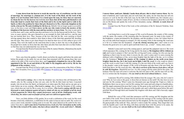 Behold , I come and I am in My coming upon it , and I put My judgment seat in it , My word which announces Me , coming for the living and for the dead , as My kingdom will be without an end , and I come to prepare it . But I am into My coming and I come , coming , for who can stop the lightning so that it may be seen when it crosses the sky , and it comes and it is seen crossing the darkness with is brightness of fire , seven times brighter than the light of the day , as it is written into the Scriptures ? Behold the country of My coming ! It shines on the earth seven times brighter than the day , for I , the Lord , am its light ; I and My word . It is the womb in which I seed My word , to arise from it with My coming . It is the new birth of the world , and I say from it to the peoples : come at the manger of My word in Romania and take from it the new birth , the birth from above , for My word says this : « He who is not born of the heaven , from above , will not be with My kingdom ». Behold the new law . It is My coming with the saints and for the saints . The holiness from the man will come to welcome Me and will open to Me , and the man will see Me , for it is written into the Scriptures : « No one shall see the Lord without holiness ». Amen .