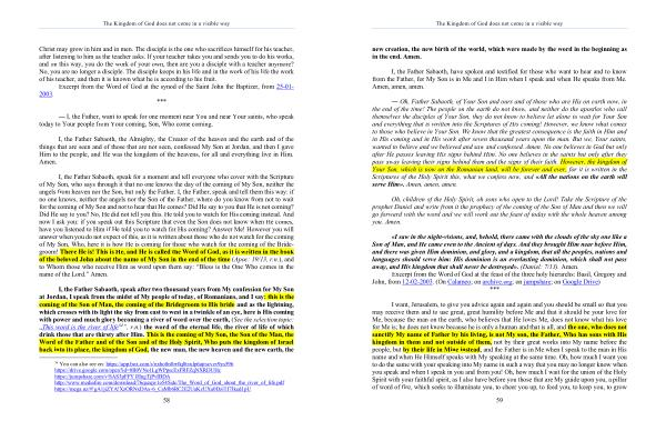 I , the Father Sabaoth , speak after two thousand years from My confession for My Son at Jordan , I speak from the midst of My people of today , of Romanians , and I say : this is the coming of the Son of Man , the coming of the Bridegroom to His bride and as the lightning , which crosses with its light the sky from east to west in a twinkle of an eye , here is His coming with power and much glory becoming a river of word over the earth , ( See the selection topic : „