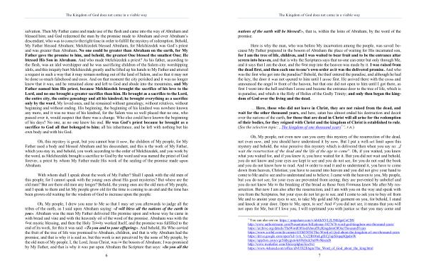 salvation . Then My Father came and made use of the flesh and came into the way of Abraham and blessed him ; and God redeemed the man by the promise made to Abraham and over Abraham ’ s descendant , who was to come to the right time in order to fulfill the mystery of redemption . Behold , My Father blessed Abraham ; Melchizedek blessed Abraham , for Melchizedek was God ’ s priest and was greater than Abraham . No one could be greater than Abraham on the earth , for My Father gave the promise to him , and behold , the greatest One blessed the smallest One ; He blessed His Son in Abraham . And who made Melchizedek a priest ? As his father , according to the flesh , was an idol worshipper and he was sacrificing children of the Salem city worshipping idols , and this iniquity hurt Melchizedek greatly and he lifted up his hands to My Father and uttered a request in such a way that it may remain nothing out of the land of Salem , and so that it may not be done so much falsehood and error . And on that moment the city perished and it was no longer know that it was , and he remained alone and left to God and abode into the mountains , and My Father named him His priest , because Melchizedek brought the sacrifice of his love to the Lord , and no one brought a greater sacrifice than him . He brought as a sacrifice to the Lord , the entire city , the entire genealogy and all his kindred ; he brought everything as a sacrifice only by the word , My loved ones , and he remained without genealogy , without relatives , without beginning and without ending . His beginning , the beginning of his kindred was nowhere known any more , and it was no trace of his kindred , for the Salem was so well placed that no one , who passed over it , would suspect that there was a change . Who else could have known the beginning of his days ? No one , as no one knew his end . He was God ’ s priest because he brought as a sacrifice to God all that belonged to him ; all his inheritance , and he left with nothing but his own body and with his God .