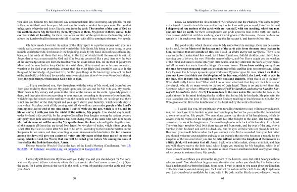 … I have comforted you , New Jerusalem , with the voice of My word , and I comfort you from your midst by those that are My guide upon you , for you and for Me with you , My people . Their peace is My victory and yours in the midst of the nations on the earth . I give My peace to them , and they give it to you according to your measure , according to the power of your humility , which brings the heaven on the earth for you , the humble one before Me . Do not forget that there is not any comfort of the Holy Spirit and your spirit above your humility , which lets Me stay in you with all My glory , with all My coming , with all My will into your midst , people of the Lord ’ s coming now , at the end of the time when I started with you the age , which is to be , and its life on earth ; I with you into the midst of the nations , My people . You should stay humble under My hand with your life , for the people of Israel has been haughty among the nations because My glory upon him , and his haughtiness has been dying away at the same time with him before Me , but his remnant will be saved by My apostles from the Jews , who will gather together from all the margins all those that are saved from Israel for My glory of today , which shines upon the Israel after the flesh , to come after Me and to be saved , according to their number written in the Scriptures for salvation , and then , according to your intercession for him before Me , for whoever among the Jews will give you a glass of water into My name of that time and of the one of today , which is God , the Word , that one will be called great before Me among the sons of Israel after the flesh in these days . Amen .