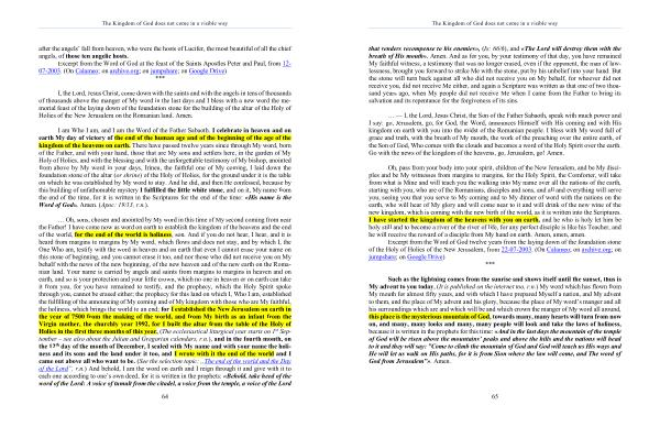 … — I , the Lord , Jesus Christ , the Son of the Father Sabaoth , speak with much power and I say : go , Jerusalem , go , for God , the Word , announces Himself with His coming and with His kingdom on earth with you into the midst of the Romanian people . I bless with My word full of grace and truth , with the breath of My mouth , the work of the preaching over the entire earth , of the Son of God , Who comes with the clouds and becomes a word of the Holy Spirit over the earth . Go with the news of the kingdom of the heavens , go , Jerusalem , go ! Amen .
