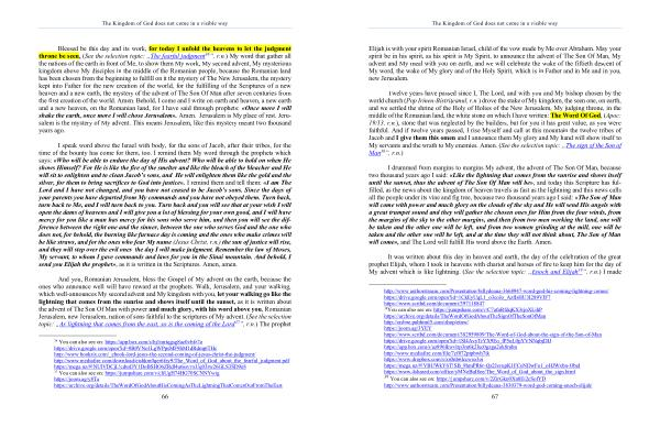 And you , Romanian Jerusalem , bless the Gospel of My advent on the earth , because the ones who announce well will have reward at the prophets . Walk , Jerusalem , and your walking , which well-announces My second advent and My kingdom with you , let your walking go like the lightning that comes from the sunrise and shows itself until the sunset , as it is written about the advent of The Son Of Man with power and much glory , with his word above you , Romanian Jerusalem , new Jerusalem , nation of sons faithful to the scriptures of My advent . ( See the selection topic : „