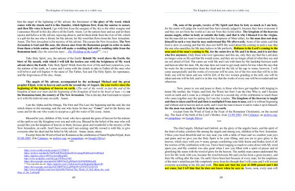 … Now , peace to you and peace to them , to those who have got together with longing to honor My mother , the Virgin , and God , the Word , her Son ! I am the One Who is , and I became word on earth and I come as a whisper of wind in a second day of the celebration to teach those who came together near the spring , for I am the Teacher . The kingdom of the heavens is taught and then is taken and lived and then is multiplied from man to man , and it is without beginning and without end in heaven and on earth , and I want the man to know it and to wake it up in himself , for the man was made by God to be holy on earth .