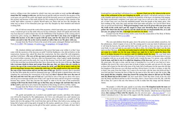 Oh , obedient children and submitted to My power that keeps your within it so that I may come with the mysteries of the heavens on earth ! I told the Sadducees , who did not believe in the resurrection , because they asked Me about the resurrection , but they asked Me with temptation , and then I told them : « The sons of this age marry and are given in marriage », and I let this word be covered within a mystery . But now , after two thousand years , when I again I speak abundantly with power and word over the earth , for I can do this because I am God , and I speak and say that it is by this word that was declared then that I have showed who are the sons of this age . But those who overcome death in them and escape from this age , they are those who are worthy to receive the age of the resurrection from among the dead , and they do no marry and are not given in marriage , because they cannot die , since they are like angels and are the sons of God , the sons of the resurrection and are not the sons of this age . Behold a mystery that is unsealed by the One Who spoke this word two thousand years ago . I Myself spoke it against those who were tempting Me concerning the resurrection of the dead and then I showed who were the sons of the men and who were the sons of God and I said that he sons of this age are those who marry and are given in marriage and the sons of the Lord ’ s age do not marry and are not given in marriage , because they cannot , since they become like angels in order to be the sons of the resurrection , coming to life from the dead of this age so that they may no longer die and that they may be of the Lord ’ s , and God is not a God of the dead but of the living , for all live in Him . Amen .