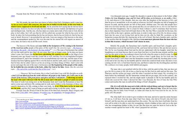 The heaven – the throne , the earth – the footstool : the man deified 45 ”, r . n .) The man of lawlessness has settled all over the earth and he says that I do not come , that I do no longer come , for he does not know when I come , but I know that he has been calculating My coming very well , as the Magi of two thousand years ago found it and they found Me as well , and they saw an accomplished Scripture and proclaimed it , and it has remained a true accomplishment up to this day , and the man of lawlessness has been fighting against Me to win the heaven and the earth , and it is not sufficient only that for him , but he rather wants to set his sin as king over these things of Mine . And I write with power and anger the end of the man ’ s lawlessness and the beginning of the people of the saints , for he builds his own eternity in his body , either for God or for him . Amen . ( See the selection topic : „ The end of the world and the Day of the Lord ”, r . n .)