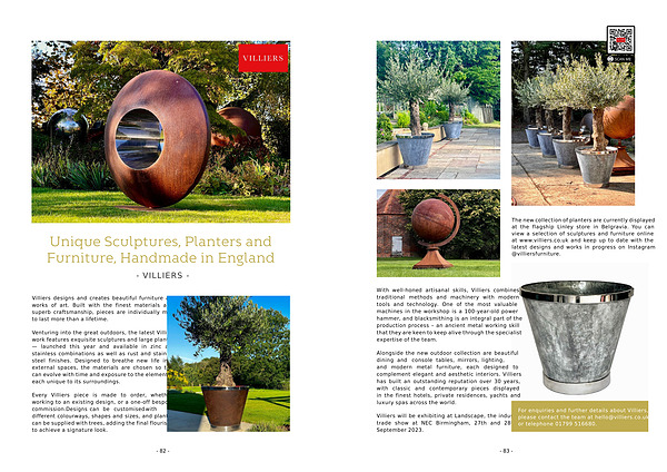 Venturing into the great outdoors , the latest Villiers work features exquisite sculptures and large planters — launched this year and available in zinc and stainless combinations as well as rust and stainless steel finishes . Designed to breathe new life into external spaces , the materials are chosen so they can evolve with time and exposure to the elements – each unique to its surroundings .