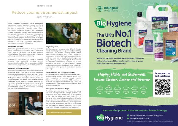 Improving Value BioHygiene ’ s core products cover 80 % of cleaning needs , simplifying stock management and streamlining operations . The residual cleaning effects reduce cleaning time , enhancing productivity - freeing up resources to enhance the guest experience . Efficient with cold water and no-rinse formulas , these products help cut utility costs . Addressing high staff turnover , BioHygiene ’ s low-hazardous formulas reduce risk , enhancing staff safety and making product training and compliance easier . Additionally , their reliable UK supply chain offers peace of mind despite societal challenges .
