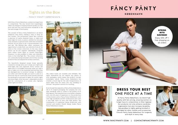At Fancy Panty København , we blend high quality with fair pricing , ensuring women no longer have to compromise on their legwear . Our products not only enhance wardrobe organization but also increase durability . Say goodbye to tights getting knotted or damaged by other clothes and accessories . Choose Fancy Panty København for longevity and style in every step .